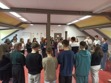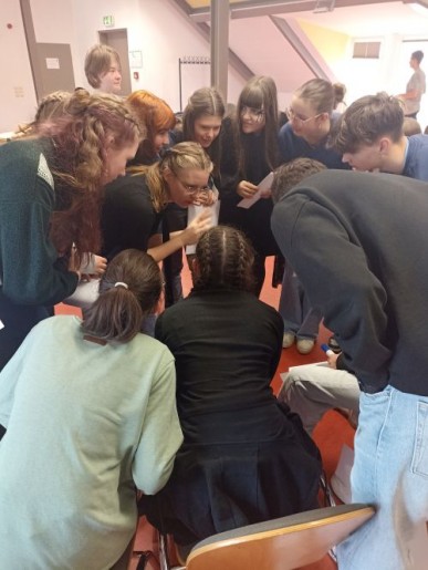 Am letzten ganzen Tag, den die deutschen und französischen Schülerinnen und Schüler in Plauen verbrachten, stand zunächst intensive Arbeit auf dem Programm. (Das Programm der vorangegangenen Tage ist >hier< nachzulesen.) In einer Gruppenaktivität namens "Schritt für Schritt" näherten sie sich dem Identitäts- und Toleranzbegriff an, dabei schlüpften alle Teilnehmer selbst jeweils in eine zugewiesene Rolle mit teilweise ungewohnten Identitätsmerkmalen. Wie auch bei den anderen Programmbausteinen führten unsere beiden Teamer alle Beteiligten super durch den Tag.