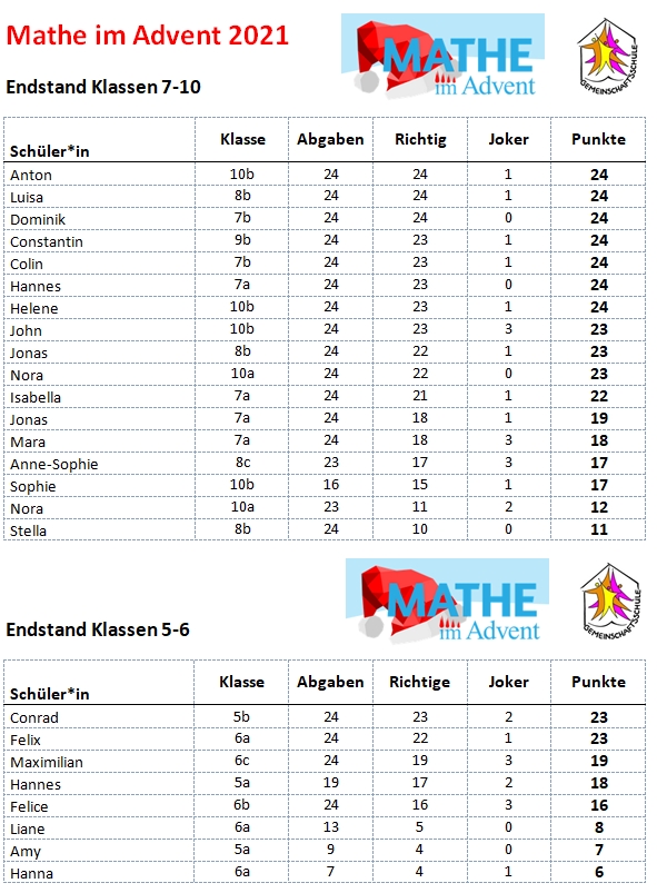 05.01.2022 - Ergebnisse des Wettbewerbs "Mathe im Advent":