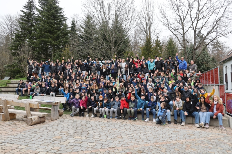 30.04.2023 - Am Freitag ging es nach dem Frühstück und der Zimmerabnahme mit den Bussen zurück zur Schule. Schnell wurde noch ein Gruppenfoto der 7 Klassen gemacht.