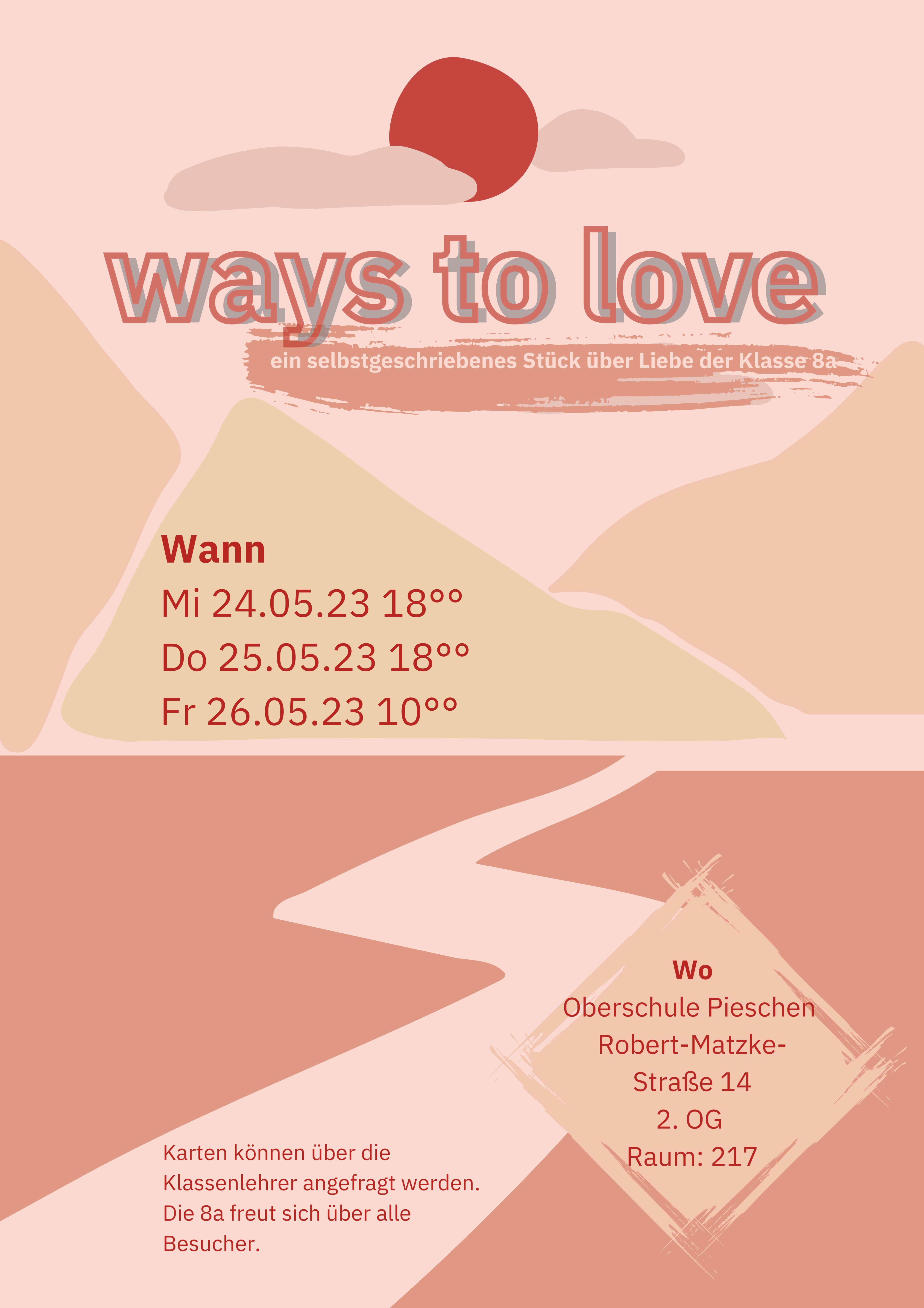 22.05.2023 - Die 8a hat auf Basis von Kurzgeschichten, welche teilweise selbst von den Schülern geschrieben worden sind, ein Stück zum Thema "ways to love" erarbeitet und wird uns während ihrer Aufführung mitnehmen, damit wir uns gemeinsam mit ihnen dem Thema nähern und in Erinnerungen schwelgen können. Mehr wird noch nicht verraten.