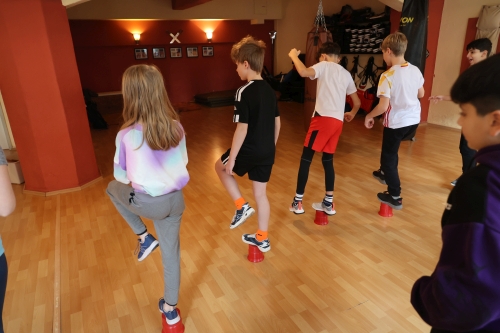 Von Frau Zadlo organisiert war unsere 5a mit Frau Kruse und Herrn Dreyer beim NugMui e.V. zu einem Selbstverteidigungskurs. Herr Eckstein demonstrierte Bewegungsabläufe und dann waren die Schüler mit dem Training dran. Die Boxsäcke waren zwar nicht Kursbestandteil, aber recht beliebt ;-) Zum Ende konnten sich die Kinder beim Mattenkampf nach klaren Regeln gegenseitig messen. Da hatten auch viele Ihr Vergnügen. (D. Dreyer)