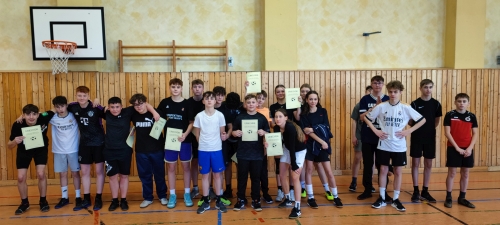 Beim Fußball-Weihnachtsturnier der 8. Klassen belegte die 8a um Kapitän Enes Yildirim den 1. Platz mit einer Optimalausbeute von 9 Punkten aus drei Spielen und einem Torverhältnis von 16:7. Auf den 2. Platz kam die 8b mit 6 Punkten (15:8). (T. Klose)