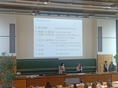 Wir trafen uns gegen 9 Uhr an der HTW und platzierten uns erst einmal in einem großen Hörsaal. Ein bisschen Eigenwerbung der Hochschule (Naaaa ... wollt Ihr vielleicht später mal hier studieren?!?) und Belehrung gehörte dazu, dann wurden fleißig Wettbewerbsaufgaben gelöst (von den Schülern) bzw. parallel dazu korrigiert (von den begleitenden Lehrern). Nach einem Mittagessen hatte jede Jahrgangsstufe einen spannenden Nachmittagsprogrammpunkt vor - seien es Polyominos, eine Physikvorlesung oder das Erstellen von Dobble-Karten.