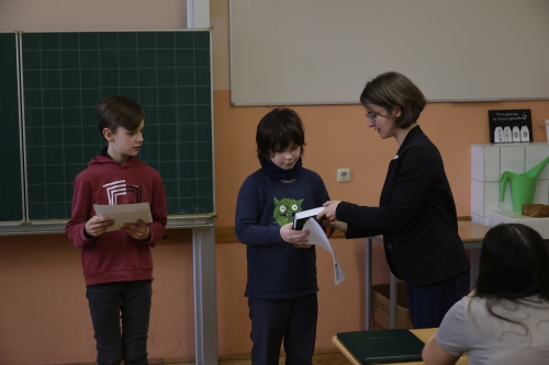 Vor den Winterferien gab es für unsere Schüler mit der Ausgabe der Halbjahresinformationen wieder die Zwischenabrechnung. Traditionell ging die Schulleitung mit verschiedenen Auszeichnungen durch die Klassen. Diemal wurde der Informatik-Biber und der Informatikwettbewerb (hier) mit Urkunden und Preisen (Danke Förderverein!) gewürdigt. Daneben gab es die Urkunden für den Wettbewerb "Schönstes Klassenzimmer" (mehr dazu hier) und unsere Sozialarbeit des cooperatio e.V. bedankte sich mit Urkunden für die Arbeit als Streitschlichter oder im Schulclub. Schulleiterin Frau Mohaupt fand in allen Klassen aufmunternde und auch kritische Worte und wünschte allen schöne Ferien. In der 5a war der Elternanteil im Zimmer besonders hoch. Die Schüler stellten auch noch ihre Ergebnisse vom Dino-Projekt vor. Prima.