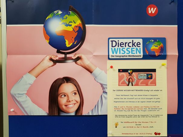 im März findet der Geographie-Wettbewerb "Diercke Wissen 2022" statt. Alle diejenigen, die - ganz unabhängig vom Geo-Unterricht - Freude am Wissen rund um unsere Welt haben, machen gerne mit. Er ist kostenlos und die Anmeldefrist ist bis zum 18.03.2022 (bei Eurem Geolehrer oder direkt bei Frau Mohaupt).