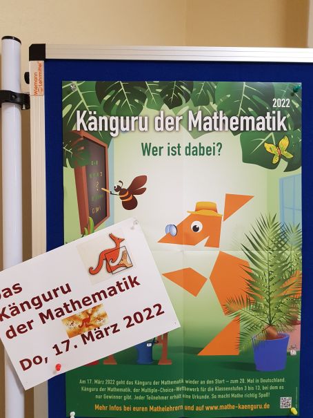 Ebenfalls im März startet wieder das Känguru der Mathematik. Es beginnt am 17.03. zu hüpfen ... für alle Schüler der Klassenstufen 5 und 6 sowie alle Schüler der Mathe-Leistungskurse. Schüler aus den Realschulkursen können sich natürlich auch gern anmelden. Fragt gern Euren Mathe-Lehrer für mehr Informationen!