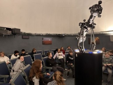 Im Planetarium wurde dann mittels eines sogenannten Planetariumprojektors der aktuelle Lauf der Sonne, die Lage der Planeten im Sonnensystem sowie der Nachthimmel simuliert. Innerhalb von nur wenigen Minuten konnte so die Sternenbewegungen einer ganzen Nacht erlebt werden, auf Knopfdruck wurden die Umrisse der Sternenbilder wie große Bärin, Kassiopeia, der Stier oder viele mehr zum Leben erweckt. Dies stieß auf große Begeisterung in beiden Klassen, die im Anschluss noch viele, spannende Fragen stellten. Nach einem abschließenden kleinen Picknick ging es mit neuen Erkenntnissen dann zurück in die Schule. Der ein oder andere wird jetzt sicher mit anderen Augen in den nächtlichen Sternenhimmel blicken.