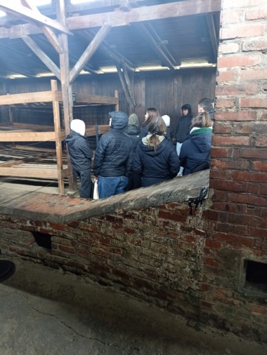 Auf einer längeren Führung erfuhren unsere Schüler vieles, was sich vor 80 Jahren am gleichen Ort abspielte. Im Gegensatz zum tags zuvor besuchten Stammlager forderte es allen etwas mehr Fokussierung und Vorstellungsvermögen ab, denn ein großer Teil der Gebäude steht nicht mehr, es gibt keine Ausstellung, sondern man muss dem Guide zuhören - und nicht zuletzt lenkten kalter Wind und Regenschauer manch einen hin und wieder ab.