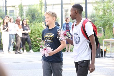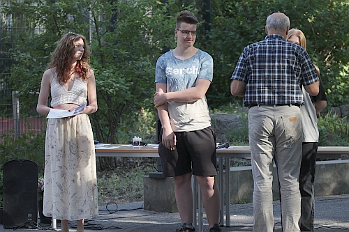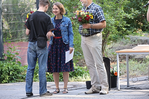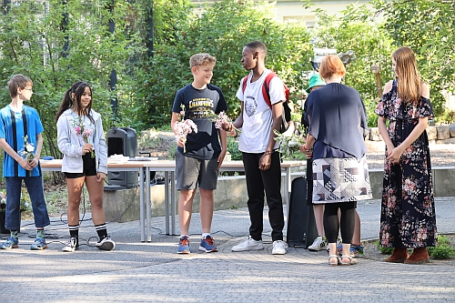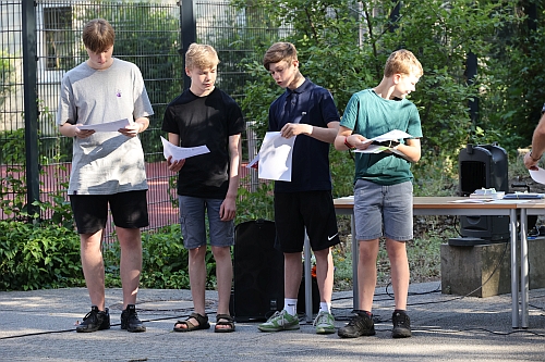 Mit dem traditionellen Treffen auf unserem Schulhof wurde Bilanz gezogen. Außerordentlich diszipliniert und wertschätzend (Danke, liebe Schüler!) gab es den verdienten Beifall für die Danksagungen, Verabschiedungen und Auszeichnungen. Stellvertretend seien genannt: