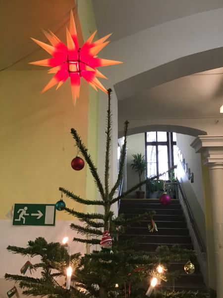 Traditionell über Herrn Nietzold und den Baumarkt hornbach schmückt wieder ein Weihnachtsbaum unser Haus. Vielen Dank für die Unterstützung. Herr Haynert kümmerte sich dann um das Aufstellen und Gestalten.