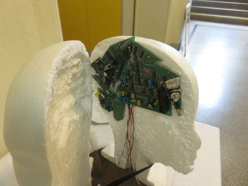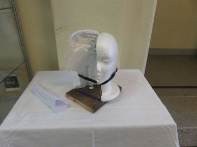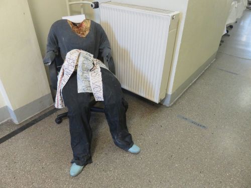 "Clarissa" stellt den Rassismus dar den wir täglich in unserem Alttag erleben. Auf den Stoffstreifen die am abgetrennten Kopf kleben stehen Sprüche von Wahlplakaten der AfD und NPD. Mit dem abgeschlagenen Kopf symbolisieren wir unsere Meinung: Rassismus töten. (Wanda, Gro)